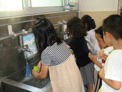 来週からのフッ化物洗口に備えて,今週は水で練習しました。左・右・前・全体と,動画に合わせて,15秒間顔を傾けてブクブクしていきました。来週から,火曜日はコップの用意をお願いします。(歯みがき用の物と兼用でOKです。)