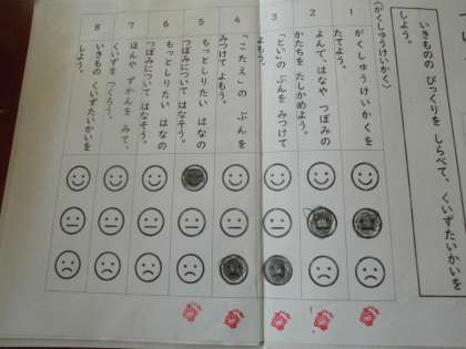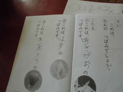 「つぼみ」は,今年度から新しく教科書に載ったお話です。問いかけの文と答えの文が繰り返し出て来ます。ノートでなく,プリントを使っての絵本張りという1年生にとっては,難しい作業や,毎時間の振り返りを書く等,新しいことにチャレンジしています。