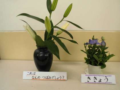 今日,校長先生から,教科書に出てくる【ききょう】の鉢植えが届き「うわあ…本物や。」「星形だ。」と,目を輝かせていました。。