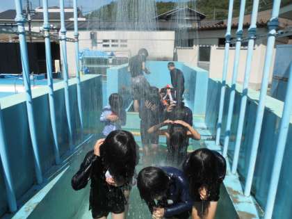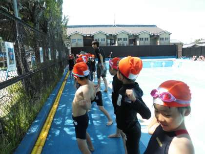 絶好のプール日和に恵まれ,一人も「寒い…」という子もなく最後まで楽しく活動できました。先輩方から伝え聞いていた【地獄のシャワー】・ストレッチ・水慣れ・バディ…と,初めてのことばかりでしたが「楽しかった。もっとやりたい。」「次はいつかな」という声が出るほど,みんな楽しかったようです。
