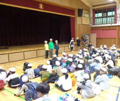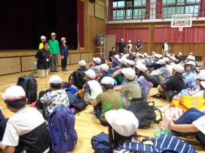 たくさんの保護者・教職員に見守られ、「花背山の家 出発式」を行いました。