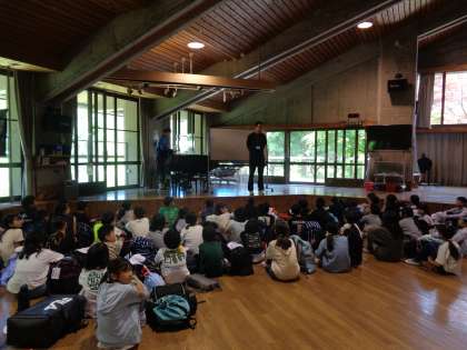 花背山の家に着いて、最初の活動、入所式です。しっかりとあいさつをして、校歌を歌いました。そして山の家の職員さんにお話をしてもらいました。しっかりとした態度で臨めました。そのあと、館内を見に回りました。