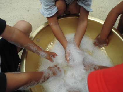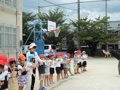 先週,大雨のために延期になっていた“さつき保育園”との二回目の交流をしました。子ども達は,前回一緒に遊んだ友だちの名前をよく覚えていて,すぐに打ち解けて楽しく遊ぶ姿がみられました。シャボン玉が風にのって綺麗に飛んでいく様子やうちわの芯を使って大きなシャボン玉が出来た時には大歓声が上がり,校舎の二階から六年生からも「わあ,いいなあ。」と声がかかるほどでした。最後は,たらいで,みんなで泡をたくさん作って遊びました。今回も「次の交流はいつかなあ…楽しみ」という感想が聞こえてきました。