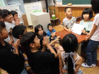 常時,活動している「郵便かかり」「お手伝いかかり」を,いいなあ…お仕事したいなあと羨ましそうしそうに見ていた他のかかりの子ども達でしたが,昨日の「遊びがかり」に続いて,今朝は「図書がかり」が,絵本の読み聞かせをしてくれました。きっと緊張したと思いますが,みんなから拍手をもらって嬉しかったことでしょう。(図書委員会の読み聞かせにあこがれてやってみようと思ったようです。異年齢の交流って大事ですね。)