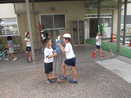 体育の学習では、竹馬や一輪車、フラフープなどを使ってようぐあそびをしました。普段からよく遊ぶ得意な遊び道具や、なじみのない道具も使いながら、いろいろな遊びに全力で楽しむ様子がみられました。