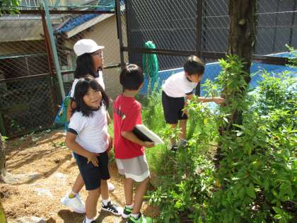 「こん虫に出会えるのはどこかな?」みんなでいろいろな予想をして、校内を探しました。池の周りや草むらなどいろいろな場所を探検し、春のときとは違うこん虫が見つかりました。どんなところにたくさんの昆虫がいるのか、次の時間にまとめていきましょうね。