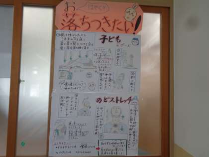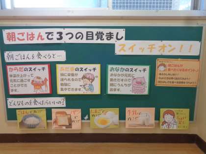 保健室前と給食室前の掲示物が新しくなっていました。簡単な体操が掲示してあったり、朝ごはんのメニュー紹介があったりと、とても楽しいものになっています。手作り感があって、すてきな掲示物です。