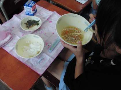 今日の給食は,子ども達が朝から楽しみにしていた「五目ラーメン」でした。お肉や野菜がたっぷりの熱々のラーメンは,子ども達のハートを鷲づかみにしたようで「ラーメン,はまるわあ」「めっちゃ!おいしい。」という声があがり,おかわりがほしいと行列ができるほどの人気でした。