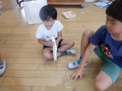 トイレットペーパーの芯や空き容器を使って,おもちゃ作りをしています。一人ひとりが色々工夫をして作ったものを,友だちに紹介し合っています。この後,グループでの交流をした後,少し先になりますが,一年生を招待する予定です。