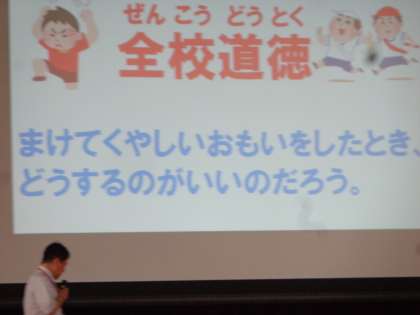 10月の朝会がありました。新しい先生や実習生の紹介の後、「金小宣言ビンゴ」の結果発表がありました。6年い組が8ビンゴで1位でした。その後、全校道徳を行いました。今回は「負けて悔しい思いをしたときに、どうすればいいのだろう」について考えました。久々に全校で集まりました。やっぱりみんなで集まるのはいいですね。
