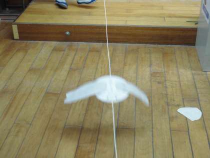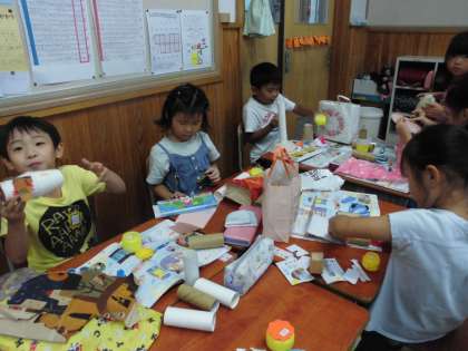 トイレットペーパーの芯や,紙皿,紙コップ等に包装紙や,おり紙,紙テープで飾り付けをした後,ビニールひもに引っかかるようクリップを取付け,スルスルと滑り落として遊びました。子ども達は「作るのは難しかったけど,滑って落ちていくのがおもしろい。」「滑るスピードが色々でびっくりした。」「みんなでやって楽しい。」といいながら,楽しく活動することが,できました。