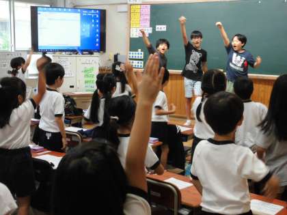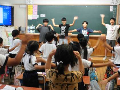 応援団の5・6年生が,明日の全校練習に向けて,応援のしかたを教えに来てくれました。【エール交換】【コール】【三・三・七拍子】等,最初は,少し恥ずかしそうだった1年生も,練習を重ねるごとに大きな声が出るようになりました。当日の応援合戦が楽しみです。