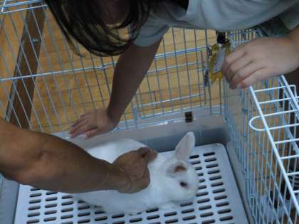 学校で飼育している,ウサギ(シュガー)が,教室に来てくれました。グループごとに様子を観察した後,一人ずつ触ってみました。「ホワホワしてる。」「あったか〜い。」「思ってたより,やわらかい。」「ちょっと臭い。」という感想が聞こえてきました。最後は餌をあげようということになり,餌のチモシーをもぐもぐする姿もしっかり見ることができ子ども達は大喜びでした。そんな「ウサギの耳が最初はピンと立っていたのに,今は,タランとしているから,シュガーちゃんこわがってるんじゃないかな…」と,心配する子もいました。命の尊さに気づけるといいですね。