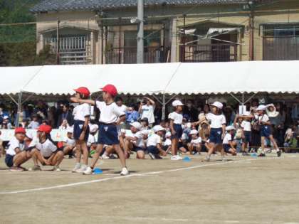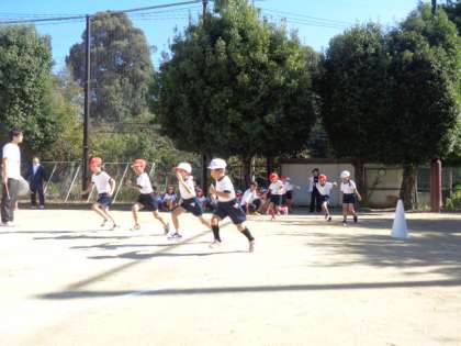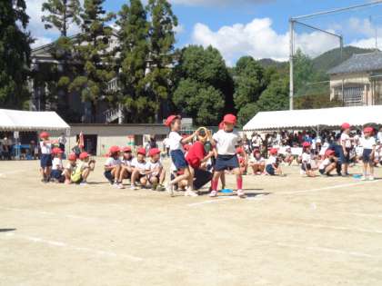 お兄さん、お姉さんにサポートしてもらいながら50m走「ゴールをめざして、レッツゴー!」や団体競技「あきらめないぞ!53人、つなぐリレー!!」、また「玉入れ」や「つなひき」と一生懸命に取り組みました☆