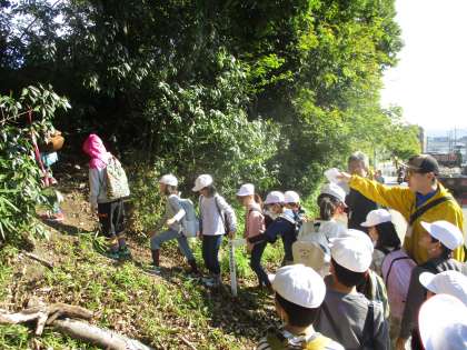 3年生は森林インストラクターの先生方にお世話になり、初めての森林教室に向かいました。衣笠山の外周を、木やキノコ、カラスの巣など、いろいろなものを発見しながら散策することができました。森林の中で風の音や生き物の声を聴きながら線で自分の気持ちを表すサウンドマップにもチャレンジし、充実した一日を過ごすことができました。