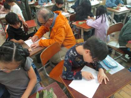 午後の時間は、衣笠山でとってきた葉のこすり出しと、どんぐりのキーホルダー作りをしました。いいお土産ができましたね。