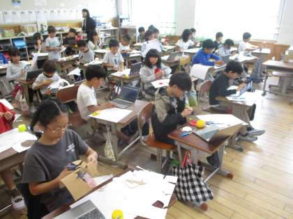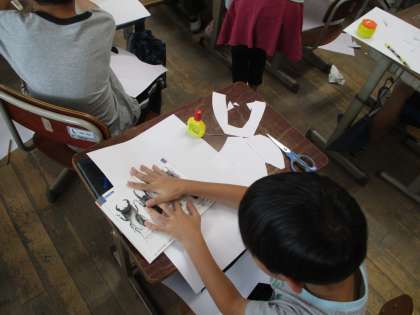 「衣笠山にいそうな生き物」を題材に、切って貼って版画の元作りが始まりました。それぞれが想像をふくらませ・・・。完成が楽しみですね。