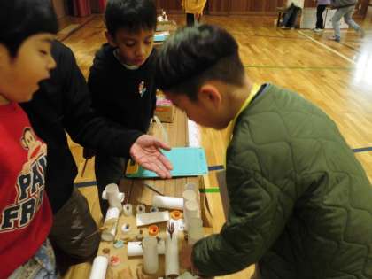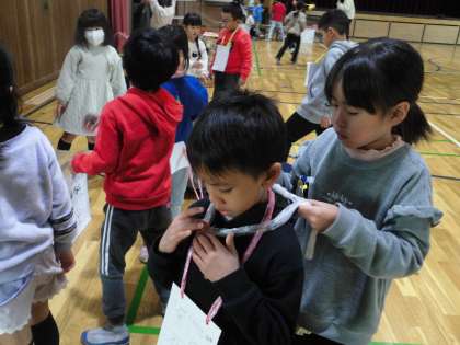 遊びのコーナーだけでなく,お面や首飾りを作ったり,楽器を鳴らしたり,おみやげのプレゼントがもらえるコーナーもあり,渡すことばかり考えていた1年生が「保育園の人に持ち帰り用の袋もいるなあ。」と,もらう側の立場にたって考えられたのは良い経験でした。
