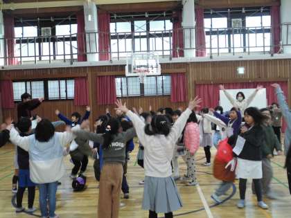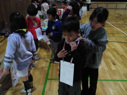 大きな声で呼込みをしたり,うまくできた時は拍手や「いいね!」「すご〜い。」という声かけ,保育園の人を想定して首飾りをつけてあげるなど,当日に向けて工夫する姿が見られました。エンディングは,みんなで【ジャンボリミッキー】の曲に合わせて,みんなでノリノリで踊りました。