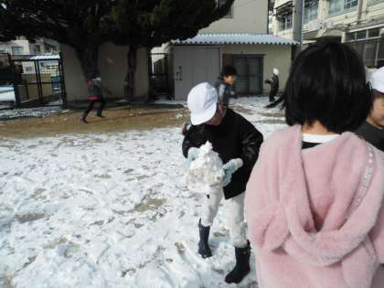 朝からの雪が,中間休みを待っていたかのようにやみ,運動場は一面の銀世界‼チャイムと共に,我先にと外へ出て,雪遊びに興じていました。大勢の子ども達が一斉に遊ぶので,大きなものは出来ませんでしたが,雪遊びの定番【雪だるま】は不動の人気でした。