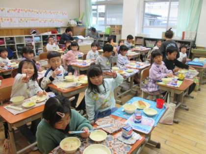 1年生と給食を食べました。以前と比べ早く食べられていたり、マナーよく食べられていたりして成長を感じました。いつも給食を食べに行くと歓迎してくれるので、本当にうれしいです。子どもと食べる給食は最高においしいです。