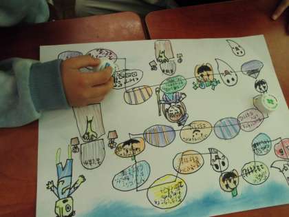 図工の学習で作ったすごろくで遊びました。最初に,うまく遊べるか各自確かめてみたところ「休みが多すぎて,全然ゴールできない。」「簡単すぎて,すぐに終わってしまう。」というものもあったので,手直しをした上で2人組で遊びました。その後,相手をかえて色々な友だちと楽しく遊べていました。