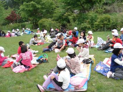 入所式の後は、宿舎に荷物を運び入れ、その後 芝生の広がる水車の斜面でお弁当を食べました。
