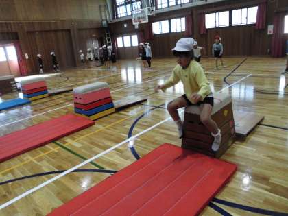 今日は,またぎ乗りとまたぎ降りから始まり,最後は開脚跳びに挑戦しました。踏み切り方や,手の着き方と着く位置に注意して練習しました。友だちと接触しないよう,手や「オッケー」の合図でスタートする約束もしっかり守って楽しく安全に活動できていました。