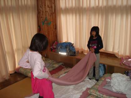 朝6時に起床して布団シーツをたたんで、7時から朝の集いを行いました。