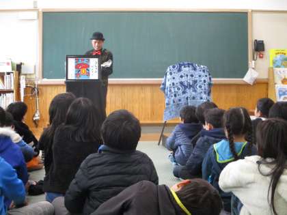 噺咲屋達郎さんにお越しいただき、オリジナルの紙芝居「宇宙ペンギン」と「まっ白おおかみ」という作品を読み聞かせしていただきました。子どもたちは紙芝居の世界にのめりこみ、とても楽しい時間を過ごさせてもらいました。