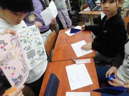 保育園との交流4part2では,掃除・自由帳・英語活動の体験,お手玉遊び,生活科・学校クイズのコーナーを,園児さんが二人ずつに分かれて体験してもらいました。最初は,お互いにドキドキしている様子でしたが,徐々に慣れて活発に活動できました。活動後「そうじがおもしろかった。」「全部楽しかった。」「保育士になりたいと思っているので,よかった。」「喜んでくれて嬉しかった。」等の感想が出されるなど,楽しく温かい時間を共有することができました。最後に【学校は楽しいよの会は大成功】という声が上がるほど,一年生の子ども達は充実感を味わうことができました。