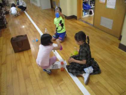 作った色をコップやペットボトルにいれて廊下や教室に並べたり、日にかざしてみたりして楽しみました。