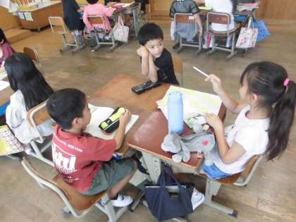 国語科では、クラスに必要な係を考えました。今日は考えをまとめる話しあいです。「このクラスに1番必要な係を決めよう」というテーマで、グループで意見を出し合いました。