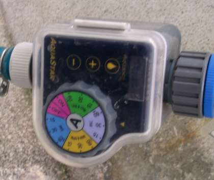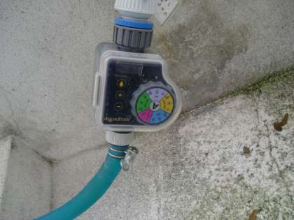 昨年度設置した水やり装置(自作)に,今年度はタイマーをつけました。