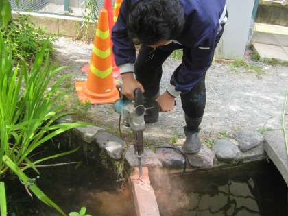 中庭のひょうたん池の真ん中を仕切っているレンガのブロックを1枚、取り除きました。