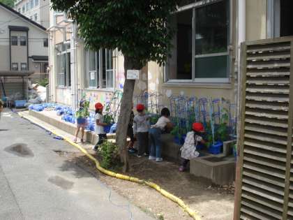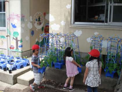 1年生が中庭で育てているアサガオが育ってきました。