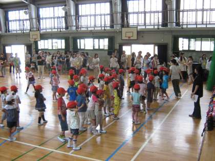 5校時に講堂で1年生の親睦会がありました。たくさんのおうちの方にお越しいただき、「じゃんけん列車」や「もうじゅうがり」などのゲームをして過ごしました。子ども達はきゃあきゃあと言いながらとても楽しそうに体全体で楽しんでいました。