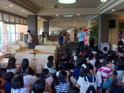 ホテルのロビーでオリエンテーションをしました。一晩お世話になるホテルの方にごあいさつをして、いよいよ部屋に入ります。このあとお風呂に入って、夕食です。どんなごちそうが出てくるか、とっても楽しみです。