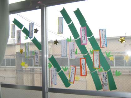 3年生の教室の窓ガラスに、七夕の笹飾りが貼られています。本物の笹ではなく、色画用紙を使って構成してあり、教室の中にも季節感があります。短冊に書かれている子ども達の願い事を見てみると、「サッカー選手になれますように」「バレリーナになれますように」という将来の夢や「テストで100点がとれますように」「宿題が早く終われるように」という勉強に関すること、「みんなが元気でくらせますように」という家族の願いなど、子ども達ひとりひとりの思いが素直に現れています。