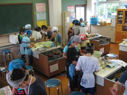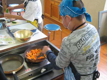 「玉ねぎ切ってても涙が出えへんわ。」とか「人参は固いから一番に炒めます。」などど言いながら、みんなで協力して作業が進んでいます。朝食ではなく、給食と一緒にお昼にいただくことになりますが、自分たちで作ったおかずはきっとおいしいでしょうね。学習を生活に生かすためにも、おうちでもぜひ作ってみてくださいね。