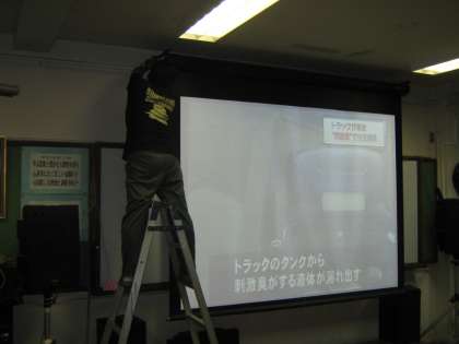 南校舎2階にある「金閣シアター」。実は、金閣シアターに設置してあるテレビはまだ地上デジタル放送を視聴することができませんでした。そこで、学校長が自ら工事をして、地上デジタル放送を視聴できるようにしました。少々傾いていたスクリーンもまっすぐに直したので、プロジェクターを通して大画面で地上デジタル放送を視聴することができます。学年全員が集まって大きな画面で番組を見ることも可能です。金閣シアターの名前通り、ますます「シアター」としての機能が充実しました!
