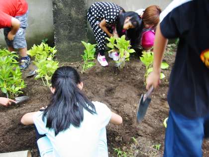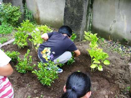 北校舎の東側に花壇を作ってにじの子学級みんなで植えました。