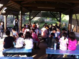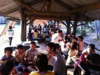 東屋で夕食を食べています。西日が差しこんできて、ちょっとまぶしいです。夜というよりはまだまだ昼に近い感じです。今夜はキャンプファイヤー。活動係の人たちは、ご飯が済んだらキャンプファイヤーの準備をします。暗くなってくるのが待ち遠しくて、ちょっとわくわくする、1日目の夕食です。