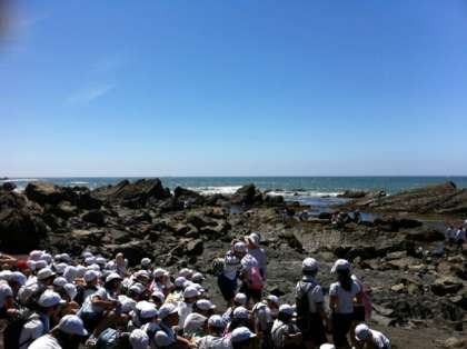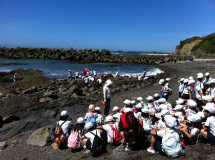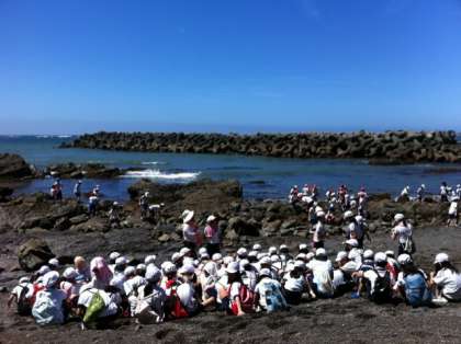 午前中は磯観察です。みさきの家から国道を渡って、歩いて10分ぐらいのところにある、宮崎浜という磯で、海の生き物を観察します。ヒトデやバフンウニ、ウミウシやアメフラシなど、潮の満ち引きによってできる「潮だまり」には、海の生き物がたくさんいます。梅干しのゼリーのような「ウメボシイソギンチャク」やきれいな水色のラインの入った「アオイロウミウシ」などという、かわった生き物もいます。そうめんのような、黄色い細長いものは、アメフラシのたまごです。みつけられたかな。