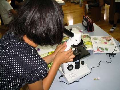 アサガオのほかにも,コスモスなどの花粉も観察しました。植物によって花粉の形は色々あることに,児童たちは興味津々でした。