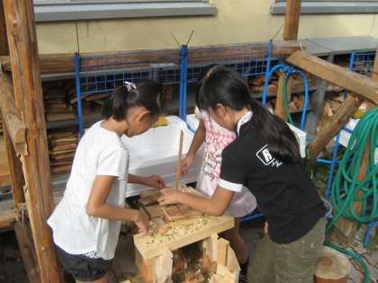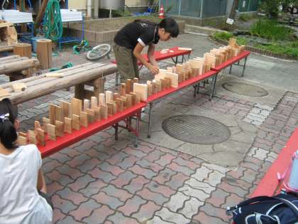放課後に何人かの子どもたちが、その木切れを積み木がわりにして家を作ったりドミノ倒しをしたりして遊んでいます。とても楽しそうで、思わずこちらも微笑んでしまいそうな光景です。