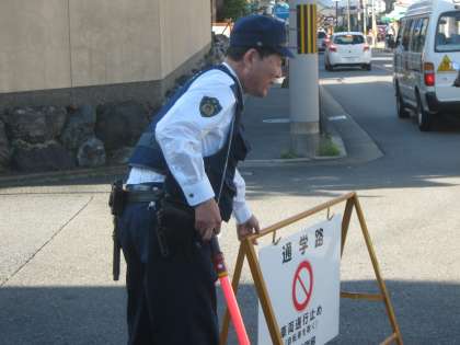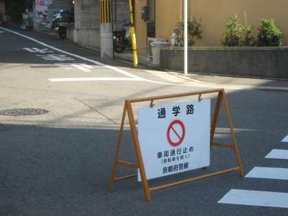 金閣小学校の周辺道路は、子ども達が登下校する時間帯は車両通行禁止になっています。このほど、北警察署より、車両通行止めの看板をいただきました。朝の通学時間帯に車が通行禁止の道路に侵入しないように、今日の朝から看板を出していただいています。地域の皆様や保護者の皆様には、普段から子どもの登下校の安全を見守っていただいていますが、子ども達の安全確保に向けた取組がまたひとつ前進しました。ありがとうございます。