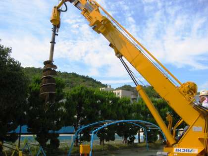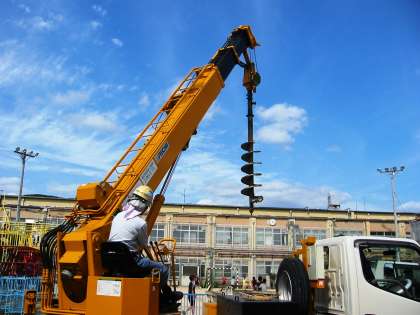 防球ネットの取り付け工事のため,大型クレーンドリルで運動場に大きな穴を開けました。