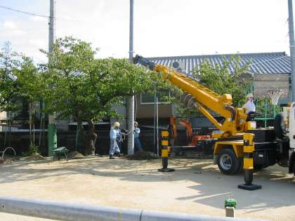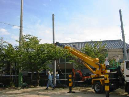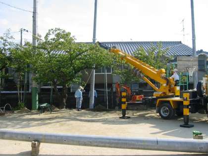 クレーンで微妙に調整しながら垂直に立っていきました。