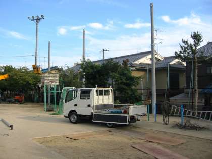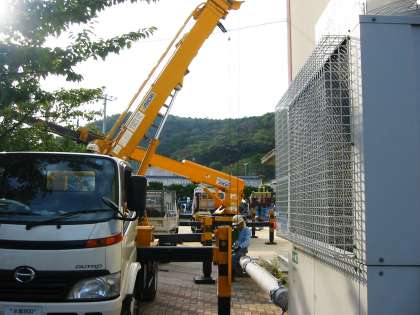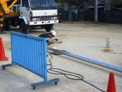 運動場の防球ネット取り付け工事で,たてた端と柱をつなぎ合わせる梁ジョイントを高所作業車で行いました。